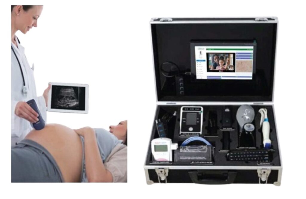 Our tele-prenatal check system features a portable ultrasound device linked to a virtual telemedicine portal and AI software for advanced prenatal diagnostics. It includes a fetal doppler and other essential tools for comprehensive monitoring. This system allows healthcare providers to perform remote prenatal checks with real-time data sharing, AI-assisted analysis, and secure communication between patients and experts, ensuring high-quality care for expectant mothers, even in remote areas.